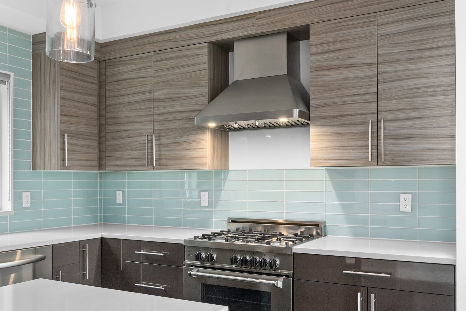 • Carrara design quartz counters w/ full-height glass tile backsplash