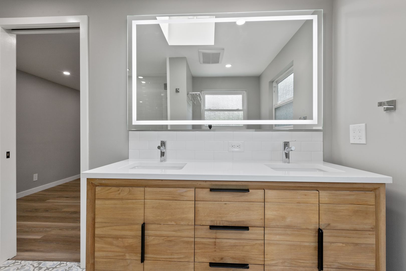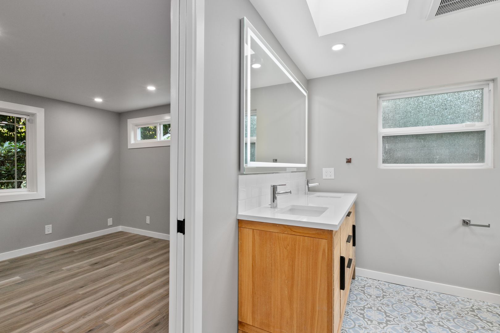 • Designer Jack n’ Jill full bath w/ dual teak vanity, oversized deep soaking tub with tiled shower and airy skylight