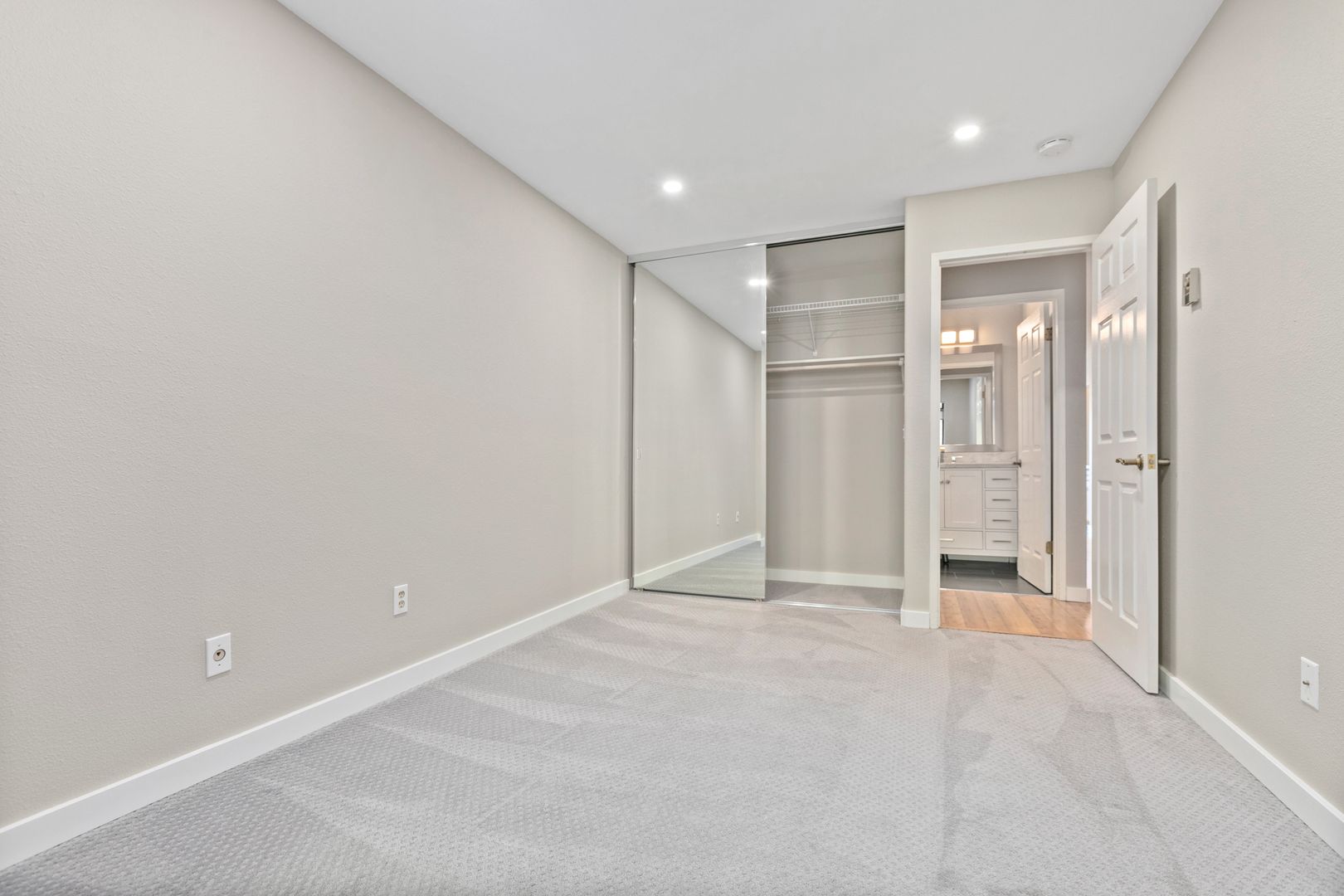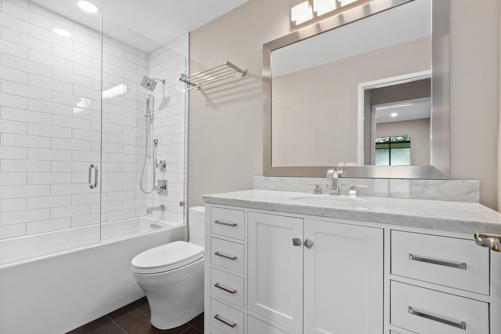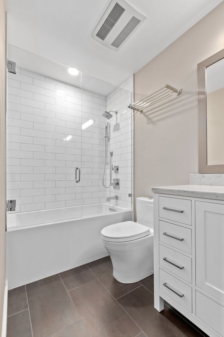 • Full shared bath w/ designer tile, Cararra Marble vanity and frameless glass enclosure