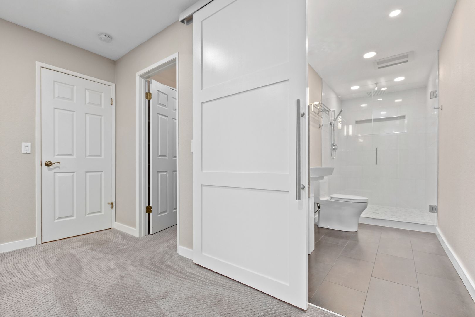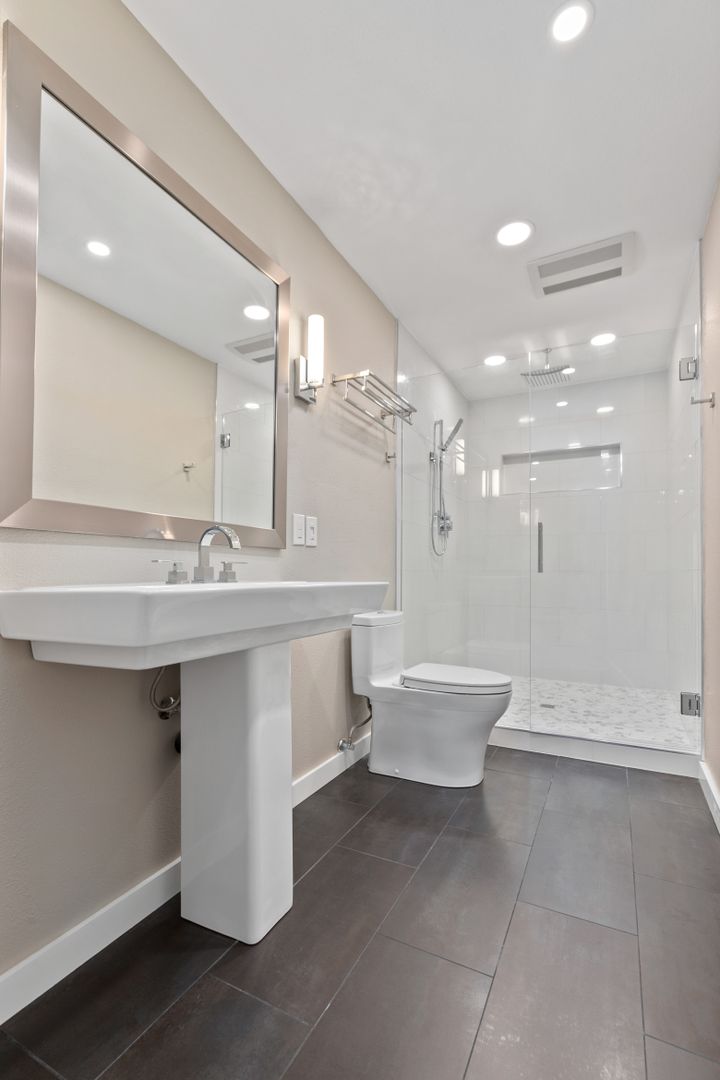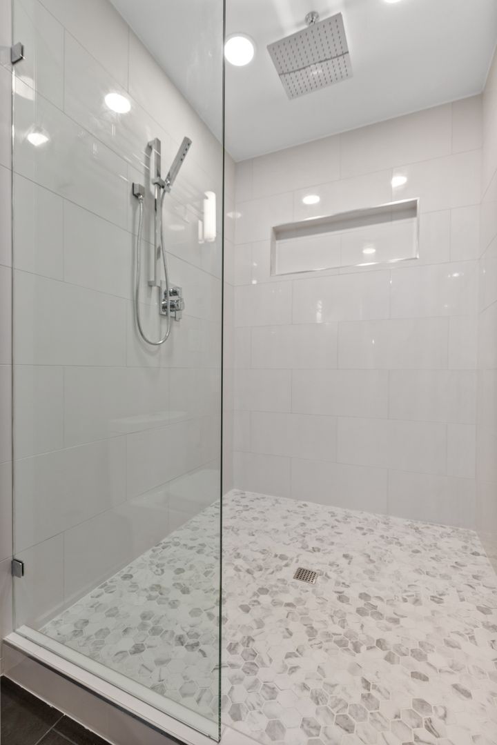• Oversized walk-in rain shower with designer tile and top-of-the-line fixtures